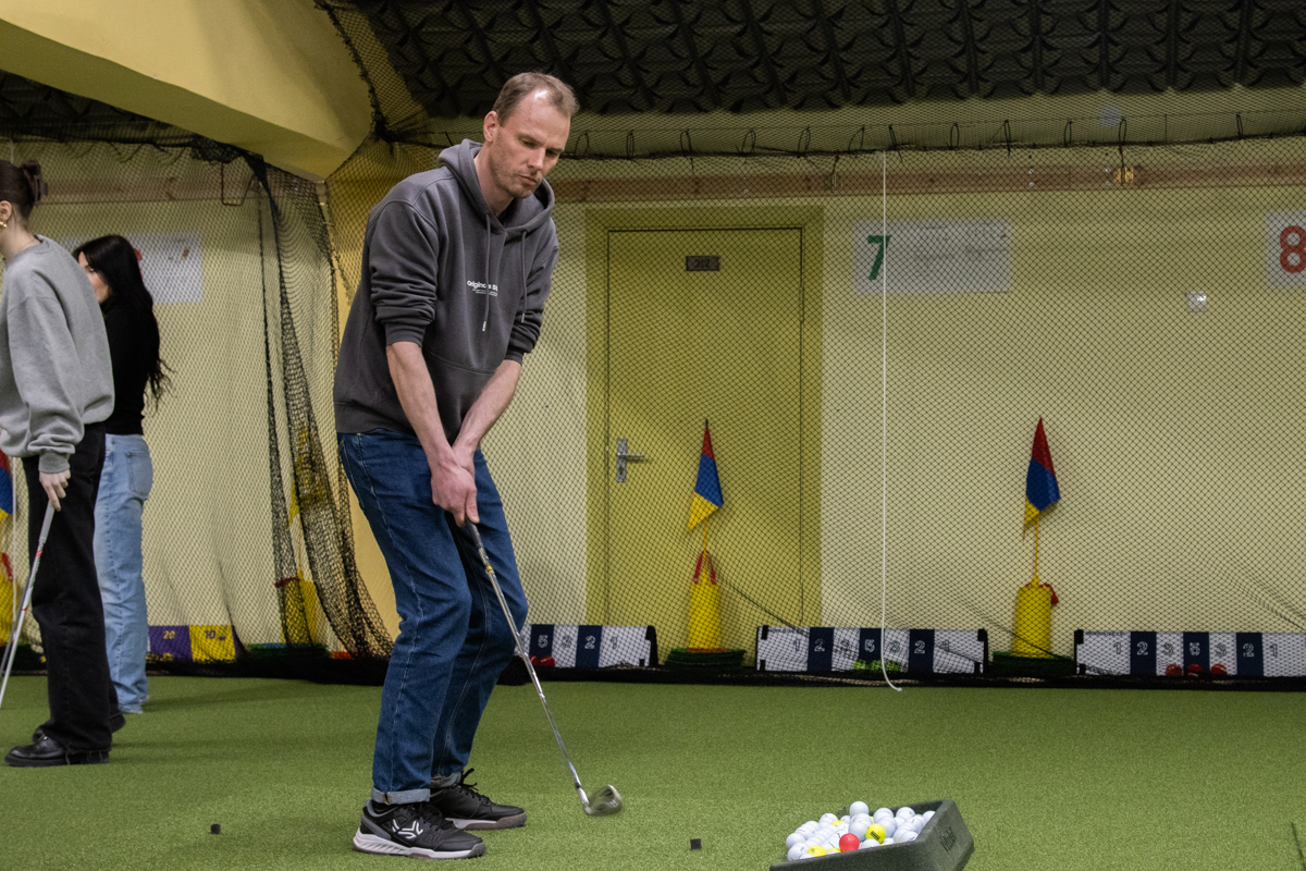 Pirmas smūgis – paprasta užduotis? Anaiptol! Kai kurie dalyviai pajuto, kad golfo lazdos valdymas ir kamuolio nukreipimas buvo daug sudėtingesnis nei atrodo iš pirmo žvilgsnio. Tačiau greitai tapo aišku, kad kaip ir scenoje, golfas reikalauja nuoseklumo ir pasitikėjimo savimi. Teatralai ne tik mokėsi smūgiuoti, bet ir analizavo strategiją – kur geriausia pataikyti, kaip naudoti lazdas, kokį smūgį pasirinkti kiekvienoje situacijoje. Remdamasis ilgamete asmenine patirtimi dėstytojas G. Mamkus teigė: „Golfas yra puikus sportas išmokantis strateginio mąstymo. Kiekvienas smūgis, kiekvienas pasirinkimas – tai apgalvotas veiksmas, kuris reikalauja ne tik fizinių įgūdžių, bet ir gebėjimo planuoti ir įvertinti galimas pasekmes.“ Aktoriai scenoje turi nuolatos numatyti įvairius veiksmų etapus ir pasiryžti rizikoms.